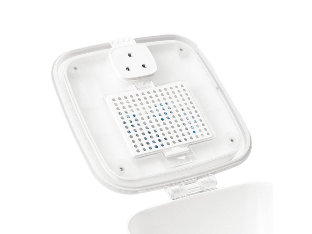 Rozhodněte se pro dávkovač, který udržuje krmivo čerstvé. Silikonová těsnění, kterými je dávkovač Fresh 2 vybaven, zaručují izolaci od vzduchu a vlhkosti a zabraňují vzniku plísní. Automatické uzavírání odsávacího otvoru chrání před hmyzem a vestavěný zásobník s vysoušedlem je zodpovědný za čerstvost každé porce. Nemusíte se také obávat rizika uvíznutí a ucpání potravin, jejichž velikost nepřesahuje 16 mm. Miska je navíc vyrobena z materiálů bezpečných pro domácí zvířata a sklon v úhlu 7° usnadňuje vašemu mazlíčkovi přijímání potravy. Demontáž a čištění zařízení probíhá efektivně a bez námahy a kabel je odolný proti pokousání.