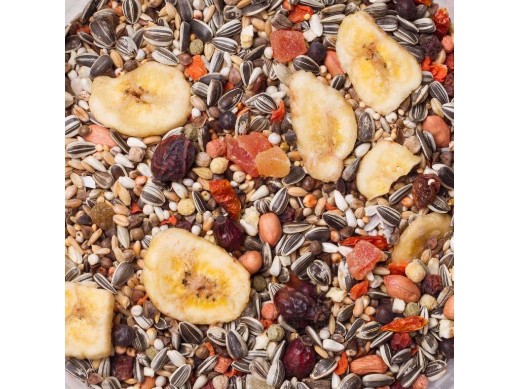 Složení: obiloviny, semena (1 % chia, 1 % quinoa), ovoce (2 % rozinky, 2 % sušený banán, 1,7 % sušené šípky, 1,7 % sušené bobule jalovce, 1,7 % sušené jeřabiny, 1,7 % sušený ananas, 1,7 % sušený papája, sušená jablka 0,8 %, zelenina (2 % sušená mrkev, 0,8 % chilli papričky), minerální látky (2 % ptačí krupice), ořechy (2 % arašídy), vedlejší výrobky rostlinného původu, droždí, oleje a tuky.Analytické složky: hrubý protein 12 %, hrubé oleje a tuky 13 %, hrubý popel 4,5 %, hrubá vláknina 13 %, vápník 0,8 %, fosfor 0,3 %, sodík 0,03 %, lysin 0,4 %, methionin 0,2 %.