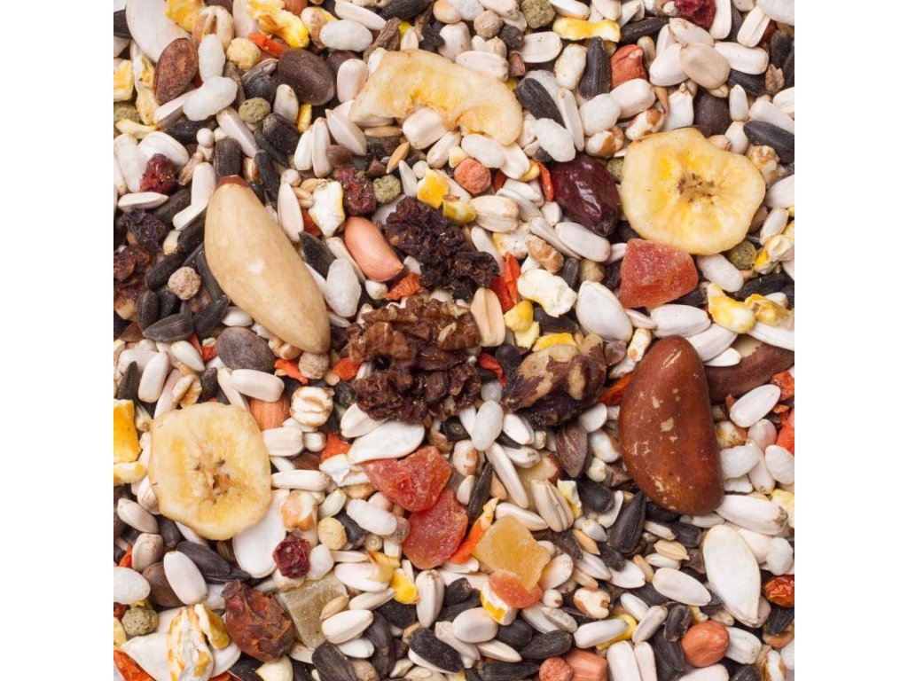 Směs obsahuje slunečnici černou, velká semena slunečnice žíhané, slunečnici bílou. Velký výběr 12 % ořechů (para ořechy, vlašské ořechy, cedrové ořechy, loupané arašídy). Směs se díky tomu odlišuje od ostatních.