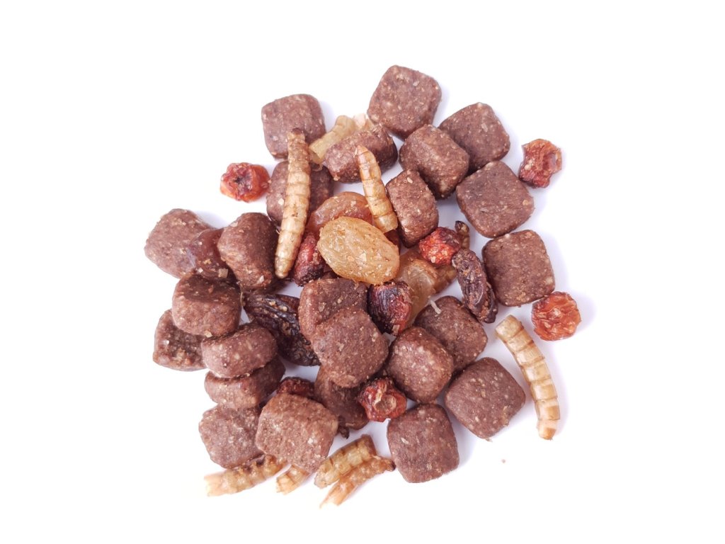 Složení:obiloviny, maso a produkty živočišného původu, ovoce, hmyz, oleje a tuky, produkty rostlinného původu, droždí.