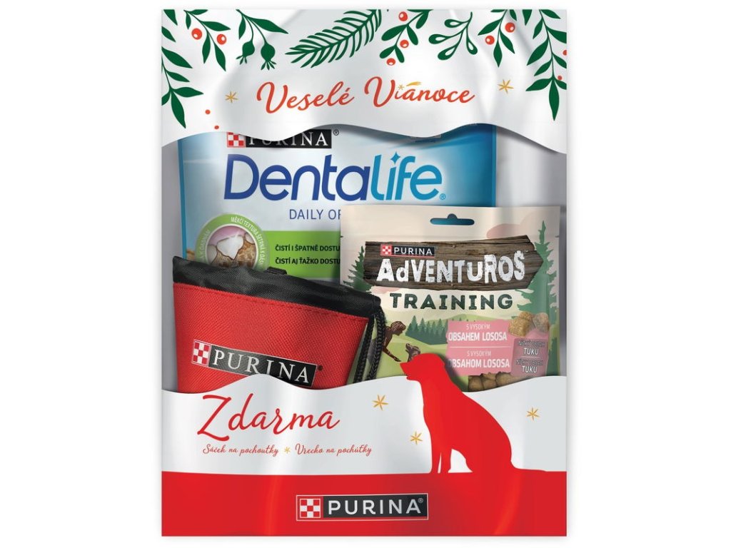 Tento balíček obsahuje Dentalife Medium 115 g pro každodenní péči o zuby, tréninkové pochoutky Adventuros s vysokým obsahem lososa 115 g, které jsou ideální jako odměna, a stylový pamlskovník pro snadné přenášení pamlsků na procházkách.