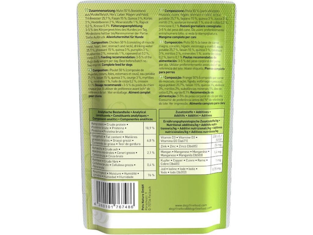 Lahodné krmivo pro psy, které obsahuje spoustu chutného kuřecího a bažantího masa, zdraví prospěšnou dýni, quinou, borůvky, řeřichu a řepkový olej. Dogz finefood obsahuje pouze suroviny vysoké potravinářské kvality a svým složením odpovídá přirozené psí stravě. Krmivo je bez konzervantů, umělých barviv a dochucovadel. Krmivo neobsahuje geneticky upravené suroviny. Jedná se o kompletní krmivo.