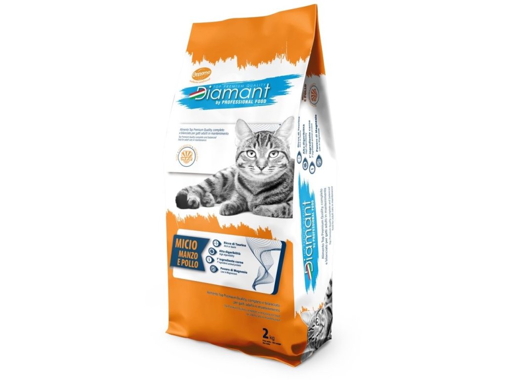 Speciální receptura krmiva Diamant micio manzo e pollo zajišťuje vysoce stravitelné bílkoviny, díky nimž je denní dávka vyvážená a snadno vstřebatelná.
