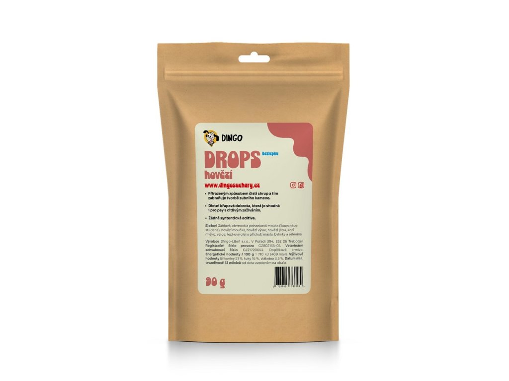 DINGO škvarkové drops krmíte suché – PŘÍMO! Vzhledem k vysokému obsahu sušiny musí mít pes přístup k pitné vodě. Denní dávku stanovujeme dle velikosti psa, jeho kondice a výkonu. Jsou vítanou svačinou v každou denní dobu.Pomalu pečené DINGO hovězí bezlepkové drops jsou vyrobeny z kvalitních lokálních surovin. Přirozenou cestou čistí zuby vašeho mazlíčka a tím se zabraňuje tvorbě zubního kamene, jsou lehce stravitelné bez přidaných konzervantů a aditiv. Dietní křupavé pečivo je vhodné i pro psy s citlivým zažíváním.Složení: jáhlová, cizrnová, pohanková mouka (lisované za studena), hovězí moučka, hovězí vývar, hovězí játra, kozí mléko, vejce, řepkový olej s příchutí másla, bylinky a zelenina