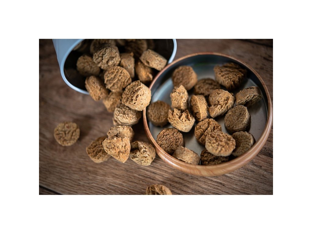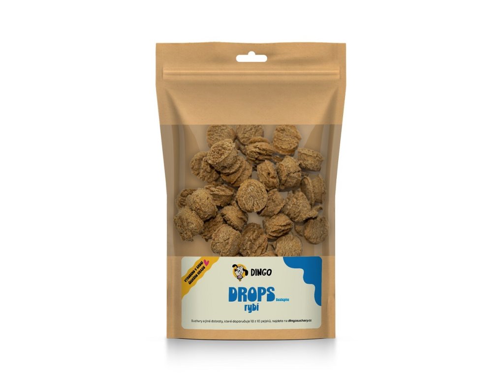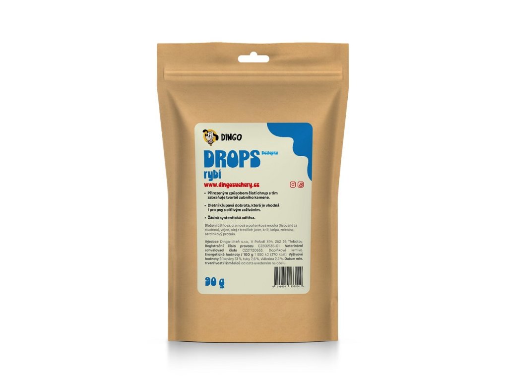 DINGO rybí drops krmíte suché – PŘÍMO! Vzhledem k vysokému obsahu sušiny musí mít pes přístup k pitné vodě. Denní dávku stanovujeme dle velikosti psa, jeho kondice a výkonu. Jsou vítanou svačinou v každou denní dobu.Pomalu pečené DINGO hovězí bezlepkové drops jsou vyrobeny z kvalitních lokálních surovin. Přirozenou cestou čistí zuby vašeho mazlíčka a tím se zabraňuje tvorbě zubního kamene, jsou lehce stravitelné bez přidaných konzervantů a aditiv. Dietní křupavé pečivo je vhodné i pro psy s citlivým zažíváním.Složení: jáhlová, cizrnová, pohanková mouka (lisované za studena),vejce, olej z tresčích jater, krill, kelpa, zelenina, sardinkový protein