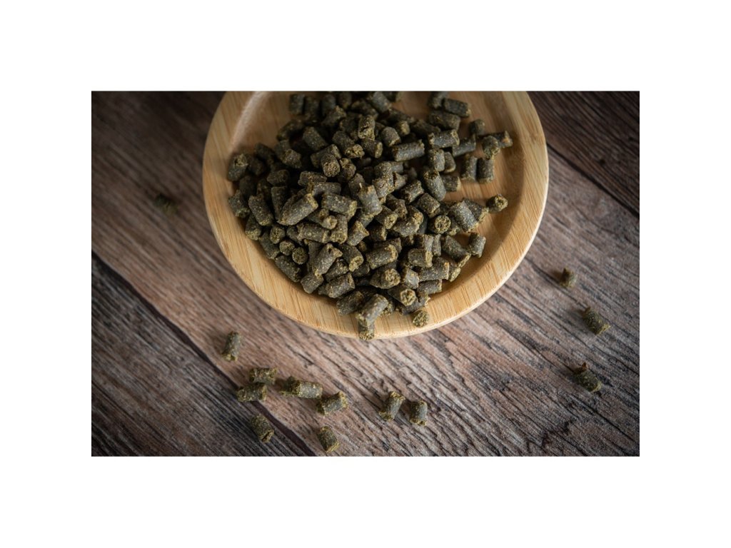 Složení: Základem je syrové rybí maso z Tresky. Dále pak výběrová Lososová moučka. Čistá hovězí a vepřová moučka. Hydrolyzovaná moučka z drůbežích jater, rybí vývar z Herinka a jemně mleté hovězí lojové škvarky. Z rostlinných pojiv to je: rýže a pohanková mouka, kukuřičné a pšeničné klíčky. Specifické vysokohodnotné suroviny: hnědá mořská řasa Kelpa, sladkovodní řasa Spirulina a Chlorella, sušená vejce, pivovarské kvasnice, hovězí kolagen, vitamín C a lososový olej. Neobsahuje obiloviny s lepkem a drůbeží maso!Obsah přirozených živin na 1 kg krmiva: Bílkoviny (NL) - 32 %, Tuk – 18 %, Vláknina - 3,2 %, Popel - 9,5, Vlhkost - 20 %, Škrob - 14 %, Vápník 3,1 %, Fosfor 1,6 %, NaCl 0,6 %, Jód 11,8 mg.Energetická hodnota: 15,27 MJ / kg = 3650 kcal.Charakteristika: Výcvikový pamlsek vyrábíme ve tvaru drobných peletek o průměru 6 mm a délce cca 4 - 6 mm. Jde o vařený produkt z převládající rybí a masové směsi s menším, pouze pro soudržnost nutným rostlinným podílem, který neobsahuje lepek.Ve směsi je 75 % živočišných surovin + 10 % vodních řas. Zbytek tvoří bezlepkové, rostlinné suroviny. Tak je ve směsi dosaženo vysokého podílu masa s velmi málým obsahem škrobu. Pamlsek má tuhou, gumovitou konzistenci, zeleno-hnědou barvu, kterou mu dodávají vodní řasy a intenzivní masitou vůni. Bez barev, ochucovadel a aromat.