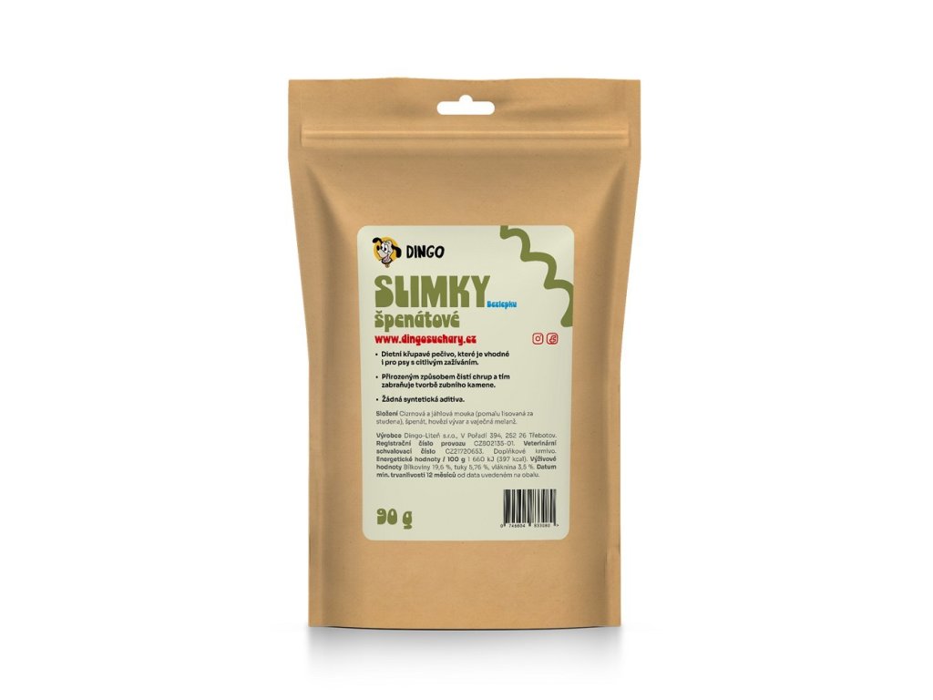 Dietní křupavé pečivo, které je vhodné i pro psy s citlivým zažíváním, přirozeným způsobem čistí chrup a tím zabraňuje tvorbě zubního kamene.Vyrobeno v srdci Českého krasu.Neobsahuje žádná syntetická aditiva.Složení: cizrnová a jáhlová mouka (pomalu lisovaná za studena), špenát, hovězí vývar a vaječná melanžAnalytické znaky: hrubý protein 19,6%, hrubý popel 1,1%, vlhkost 9,73%, hrubé oleje a tuky 5,76%, hrubá vláknina 3,5%