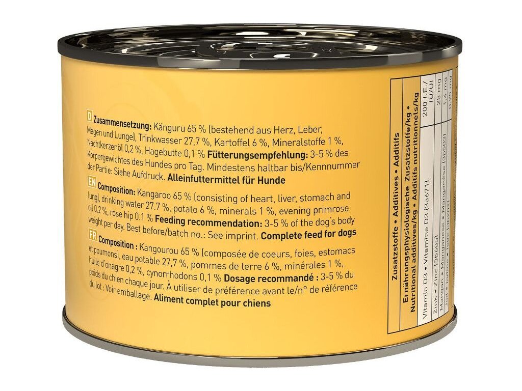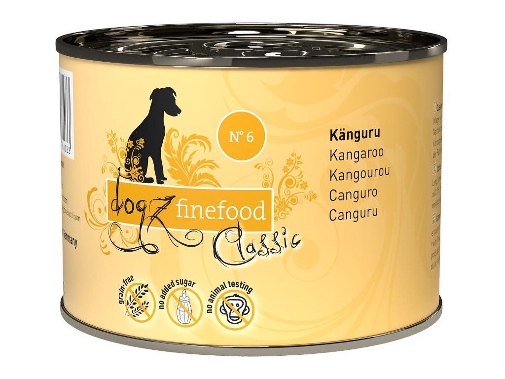 Lahodné krmivo pro psy, které obsahuje spoustu klokaního masa, brambory, zdraví prospěšný pupalkový olej a šípky. Dogz finefood obsahuje pouze suroviny vysoké potravinářské kvality a svým složením odpovídá přirozené psí stravě. Krmivo je bez konzervantů, umělých barviv a dochucovadel. Krmivo neobsahuje geneticky upravené suroviny. Jedná se o kompletní krmivo.Složení: klokaní vnitřnosti 65% (srdce, játra, žaludky a plíce), voda 27,7%, brambory 6%, minerály 1%, pupalkový olej 0,2% a šípky 0,1%.Analýza: hrubý protein 9,8%, hrubý tuk 6,2%, hrubý popel 2,1%, hrubá vláknina 0,4%, vlhkost 77%Nutriční doplňkové látky: vitamín D 200 IE, zinek 25 mg, mangan 1,4 mg, jód 0,75 mgDoporučené dávkování: 3-5% tělesné hmotnosti psa denně, zajistěte psovi dostatek pitné vody.