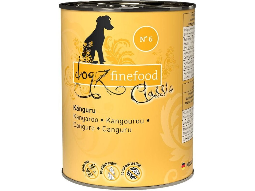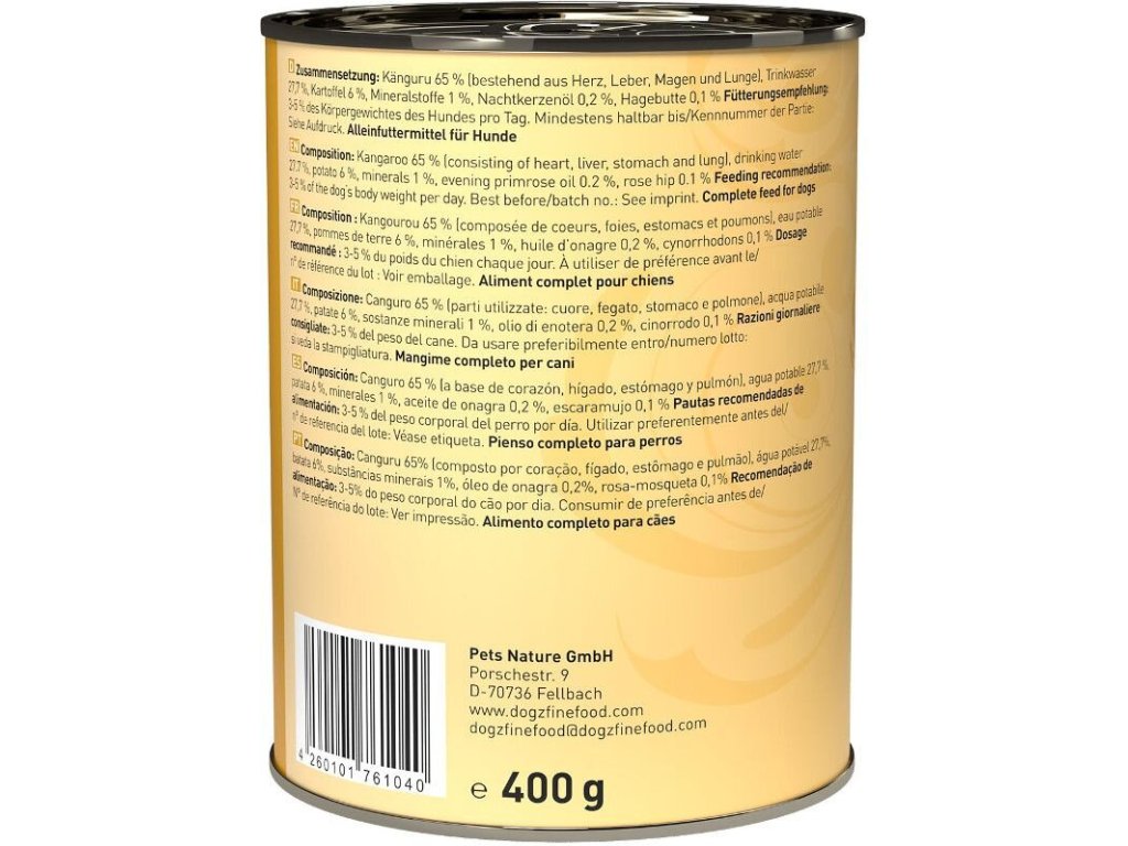 Lahodné krmivo pro psy, které obsahuje spoustu klokaního masa, brambory, zdraví prospěšný pupalkový olej a šípky. Dogz finefood obsahuje pouze suroviny vysoké potravinářské kvality a svým složením odpovídá přirozené psí stravě. Krmivo je bez konzervantů, umělých barviv a dochucovadel. Krmivo neobsahuje geneticky upravené suroviny. Jedná se o kompletní krmivo.Složení: klokaní vnitřnosti 65% (srdce, játra, žaludky a plíce), voda 27,7%, brambory 6%, minerály 1%, pupalkový olej 0,2% a šípky 0,1%.Analýza: hrubý protein 9,8%, hrubý tuk 6,2%, hrubý popel 2,1%, hrubá vláknina 0,4%, vlhkost 77%Nutriční doplňkové látky: vitamín D 200 IE, zinek 25 mg, mangan 1,4 mg, jód 0,75 mgDoporučené dávkování: 3-5% tělesné hmotnosti psa denně, zajistěte psovi dostatek pitné vody.