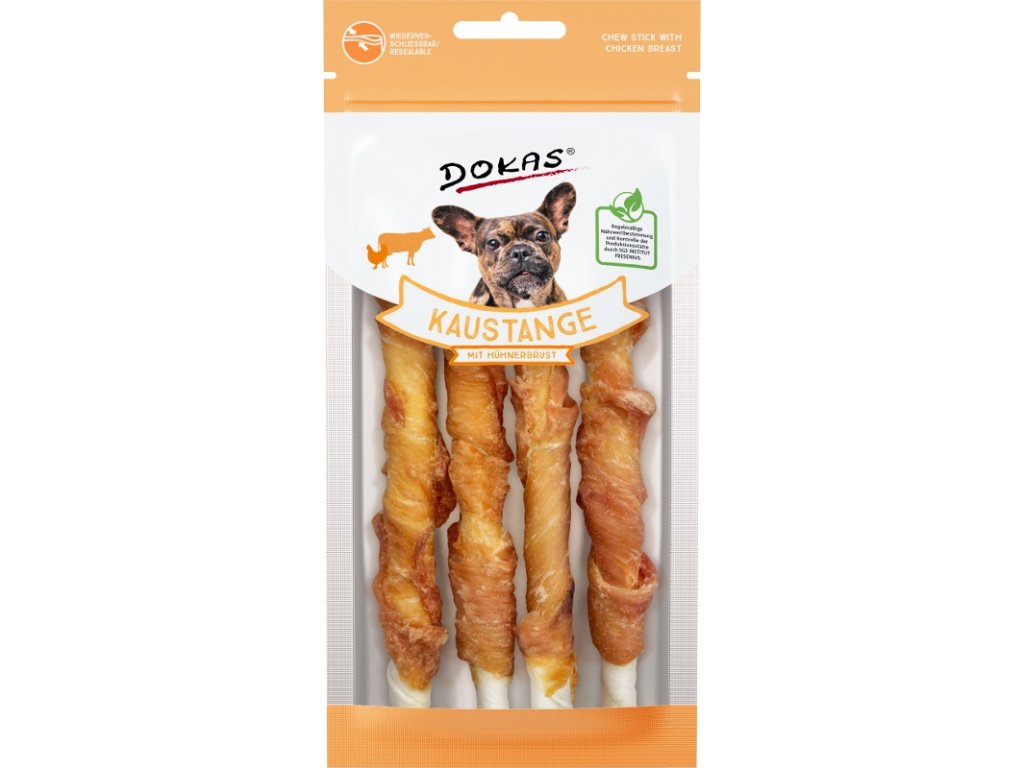 Oblíbené tyčinky z hovězí kůže potažené kuřecím prsním filetem jsou klasikou, která neomrzí. Jejich žvýkání psy zabaví, posiluje žvýkací svaly a pomáhá udržovat zdravé zuby a dásně. Nyní v balení 50 g, které se vejde do kapsy a hodí se tak i na cesty, nebo jako pochoutka pro menší pejsky.
