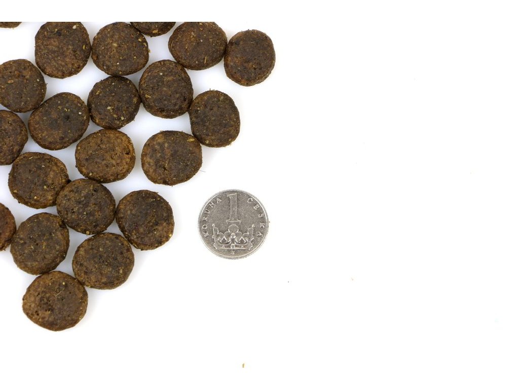 Hrubá bílkovina 25 %, hrubé tuky 16 %, hrubá vláknina 4 %, anorganické složky 7,5 %, vlhkost 10 %, vápník 1,4 %, fosfor 1,0 %, Omega 3 0,1 %, Omega 6 0,25 %.