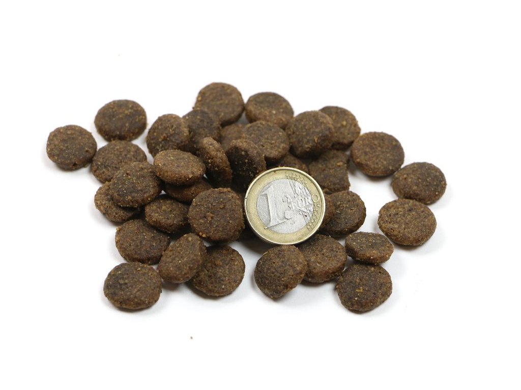 Hrubá bílkovina 29 %, hrubé tuky 15 %, hrubá vláknina 2,5 %, anorganické složky 7 %, vlhkost 10 %, vápník 1,4 %, fosfor 0,9 %, Omega 3 0,15 %, Omega 6 1,85 %.