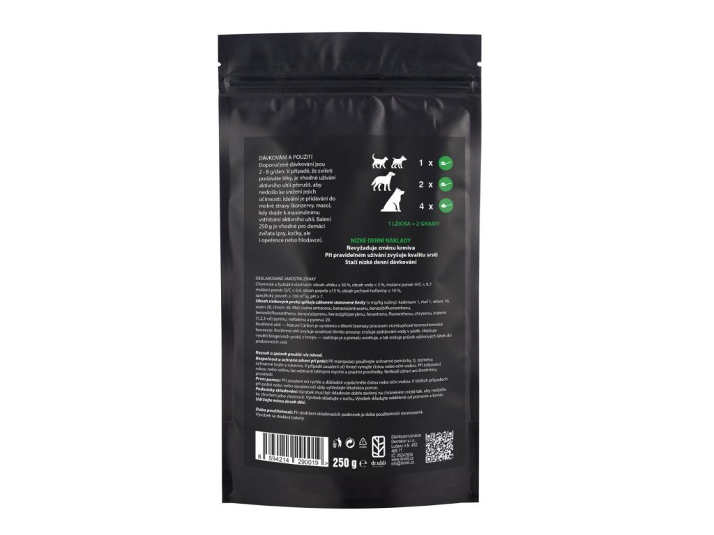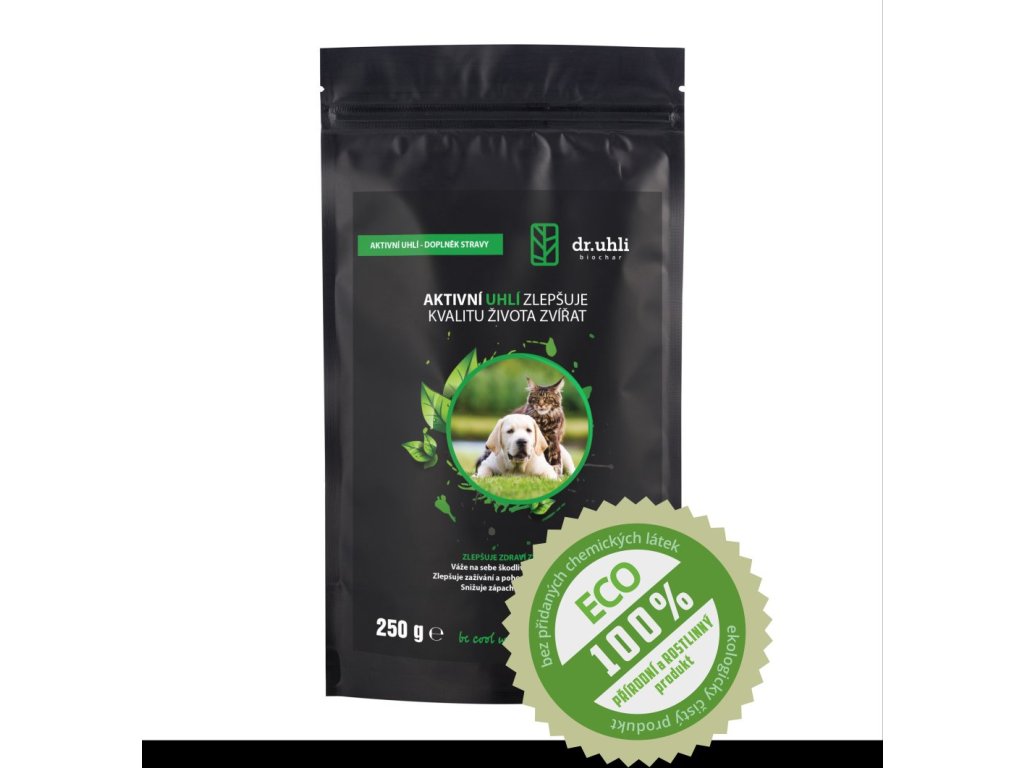 Praktické balení drceného biocharu ve formě prášku se zrnitostí (frakce) 0-1 mm, pro zdraví vašich domácích mazlíčků. Aktivní uhlí na sebe váže škodliviny a výsledkem je lepší kondice vašich miláčků. Hmotnost 250 gramů vystačí zhruba na 60 dní pro 30 kg psa.