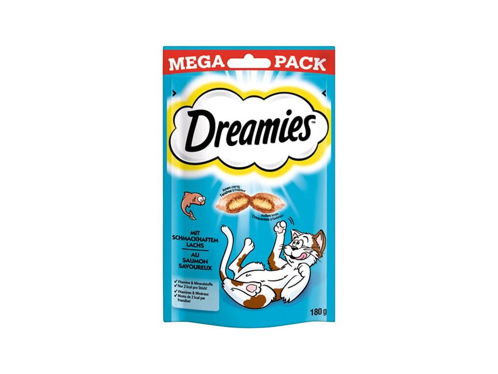 Dreamies křupavé polštářky plněné jemným krémem s příchutí lososa. Lahodná, pro kočky lákavá pochoutka dreamies, které žádná kočka neodolá, přímo vybízí k rozmazlování Vašeho mazlíčka. Pamlsek dreamies zpestří krmivo a kočka se něj bude těšit stejně jako na Váš příchod domů.