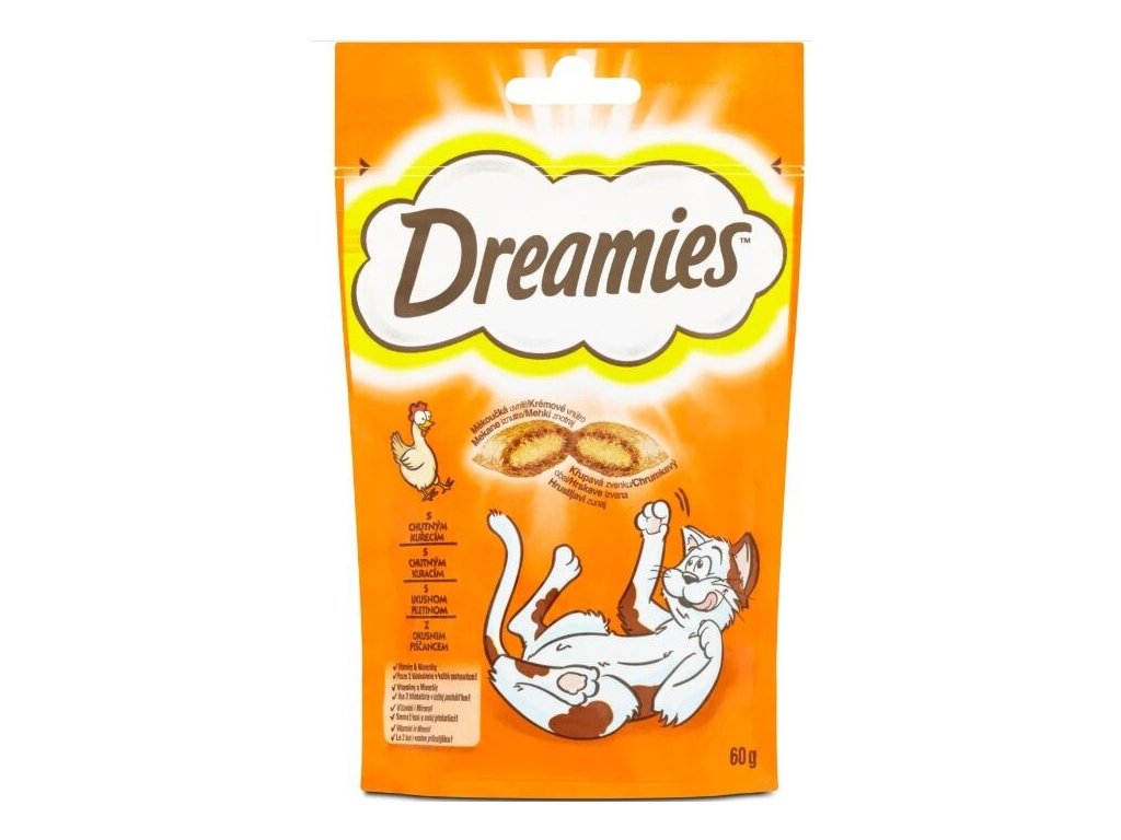 Dreamies křupavé polštářky plněné jemným krémem s příchutí kuřete. Lahodná, pro kočky lákavá pochoutka Dreamies, které žádná kočka neodolá, přímo vybízí k rozmazlování Vašeho mazlíčka. Pamlsek Dreamies zpestří krmivo a kočka se něj bude těšit stejně jako na Váš příchod domů.