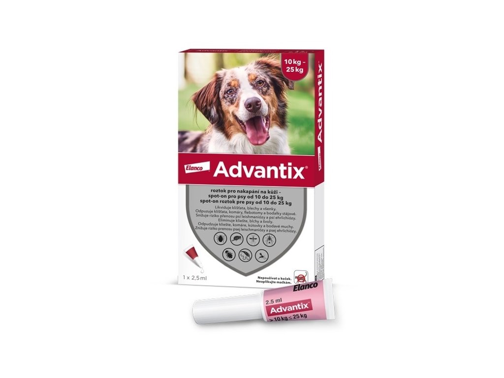 Advantix Spot On 1x 0,4 ml - Vysoce spolehlivá ochrana proti klíšťatům, blechám a komárům pro psy od 10Kg do 25Kg. Velmi jednoduchá aplikace pomocí pipety. Advantix poskytuje Vašemu pejskovi navíc ochranu i při namočení, zabíjí larvy blech i v okolí pejsků, odpuzuje parazity a zabíjí je, je vhodný pro štěňata od 7 týdnů věku i pro březí a kojící feny. Navíc nezapáchá, nešpiní ani nemastí srst pejska.