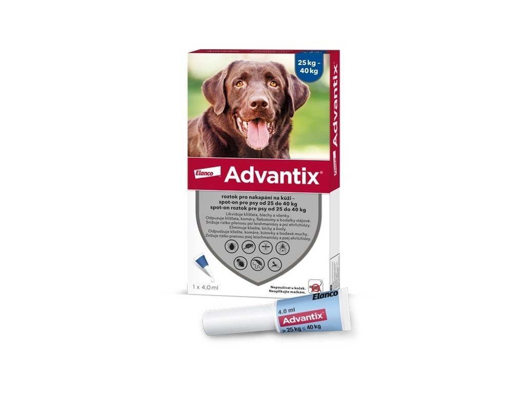 Advantix Spot On 1x 0,4 ml - Vysoce spolehlivá ochrana proti klíšťatům, blechám a komárům pro psy nad 25Kg. Velmi jednoduchá aplikace pomocí pipety. Advantix poskytuje Vašemu pejskovi navíc ochranu i při namočení, zabíjí larvy blech i v okolí pejsků, odpuzuje parazity a zabíjí je, je vhodný pro štěňata od 7 týdnů věku i pro březí a kojící feny. Navíc nezapáchá, nešpiní ani nemastí srst pejska.