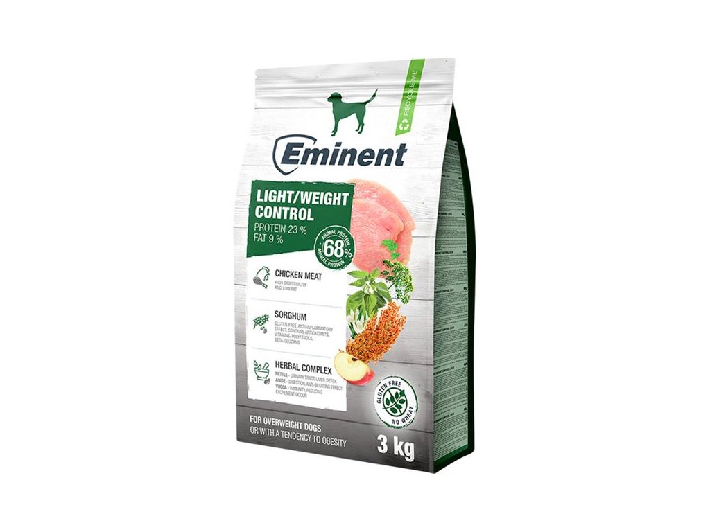 Kompletní krmivo Eminent Light/Weight Control je speciálně formulované pro psy, kteří mají problémy s nadváhou nebo k ní mají sklony. Nízký obsah tuků a kalorií společně s CLA (konjugovanou kyselinou linolovou) pomáhají snižovat tělesnou hmotnost bez rizika ztráty důležitých živin. Kuřecí maso vyniká vysokou stravitelností a nízkým obsahem tuku. Čirok neobsahuje lepek, má protizánětlivé účinky, obsahuje antioxidanty, vitamíny, polyfenoly a beta-glukany podporující imunitní systém a celkové zdraví. Obsažené byliny a juka (Yucca schidigera) posilují imunitní systém a zlepšují celkové zdraví. Kopřiva a anýz podporují zdraví jater a trávení.