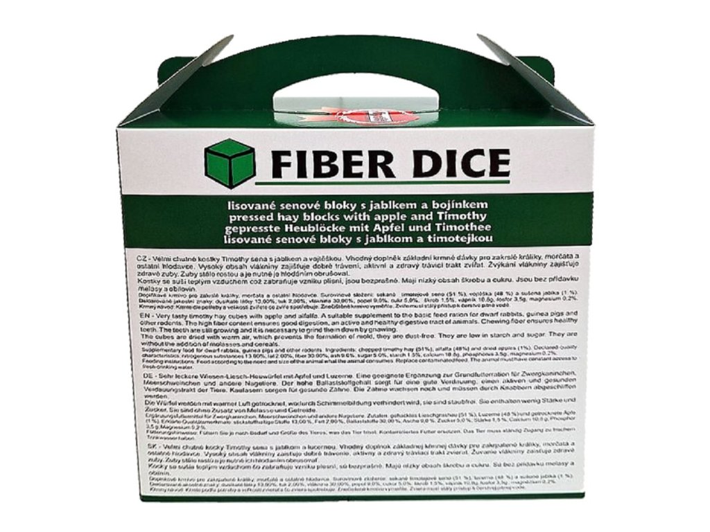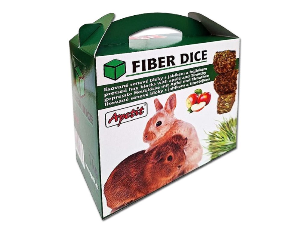 Doplňkové krmivo Apetit Fiber Dice je ideální pro zakrslé králíky, morčata a další druhy hlodavců. Kostky ze sušeného Timothy sena obohacené o jablko a vojtěšku poskytují vysoký podíl vlákniny, který podporuje zdravé trávení a přirozené obrušování zubů. Díky šetrnému sušení teplým vzduchem jsou kostky bezprašné a bez rizika výskytu plísní.