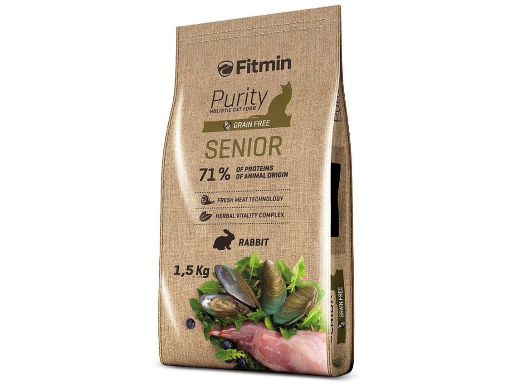 Kompletní krmivo Fitmin pro starší kočky více než 8 let s podpůrnými doplňky pro zdraví. Až 71% proteinů živočišného původu.