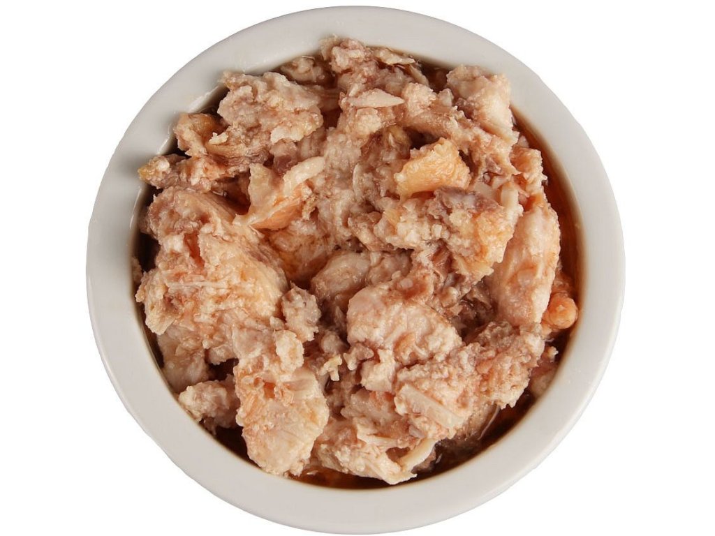 Kuřecí prsa, losos. Konzerva může obsahovat kosti.