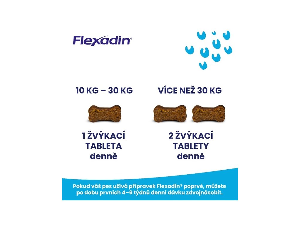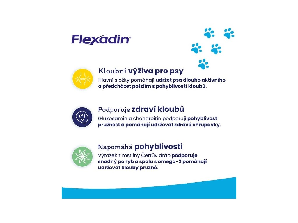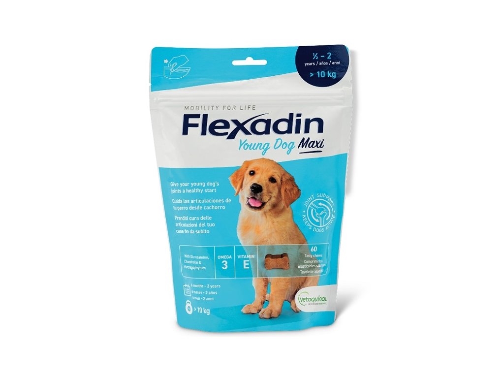 Flexadin Young Dog Maxi je speciální kloubní doplněk pro mladé psy velkých plemen od 6 měsíců do 2 let, navržený s cílem podpořit zdraví jejich kloubů a správnou funkci chrupavek. Inovativní receptura, obsahující pět vysoce kvalitních složek, je zaměřena na prevenci problémů spojených s pohyblivostí kloubů. Chutné žvýkací tablety obsahují látky, které přirozeně podporují zdravou kloubní chrupavku, včetně glukosaminu a chondroitin sulfátu. Dále pak obsahují omega-3 mastné kyseliny, mangan pro zdravý růst chrupavky, vitamín E s antioxidačními vlastnostmi a rostlinný extrakt Ďáblův dráp (Harpagofyt ležatý) s protizánětlivými účinky. Flexadin Young Dog Maxi je tak kompletním řešením pro dlouhodobou péči o klouby vašeho mladého psa.