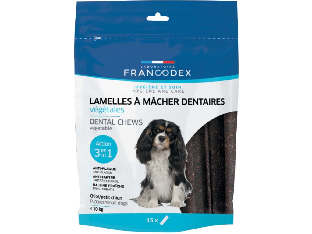 Francodex žvýkací plátky pro psy od 5 do 10 kg – velikost S 15 plátkú, hmotnost 224 g Žvýkací plátky jsou velmi lehko strávitělné. Jejich tvar a textura usnadňuje žvýkaní a zlepšuje číštení zubú . Mechanické abrazivní působení pomáhá snížit povlak na zubech a tvorbu zubního kamene. V důsledku toho podporuje svěží dech. Doplňkové krmivo pro psy mezi 5 a 10 kg Omezení zubného povlaku, osvěží dech Pokyny pro správné použití : Po krmení podávajte 1 zeleninový žvýkání plátek denně. Čerstvá pitná voda by měla být vždy k dispozici . Složení : kukuřičný škrob , glycerin, sójový protein , rýžová mouka, pivovarské kvasnice, sorbitor, hrubý popel 1,8 procenta Skladování: skladujte v suchu při teplotě do 25 stupňů