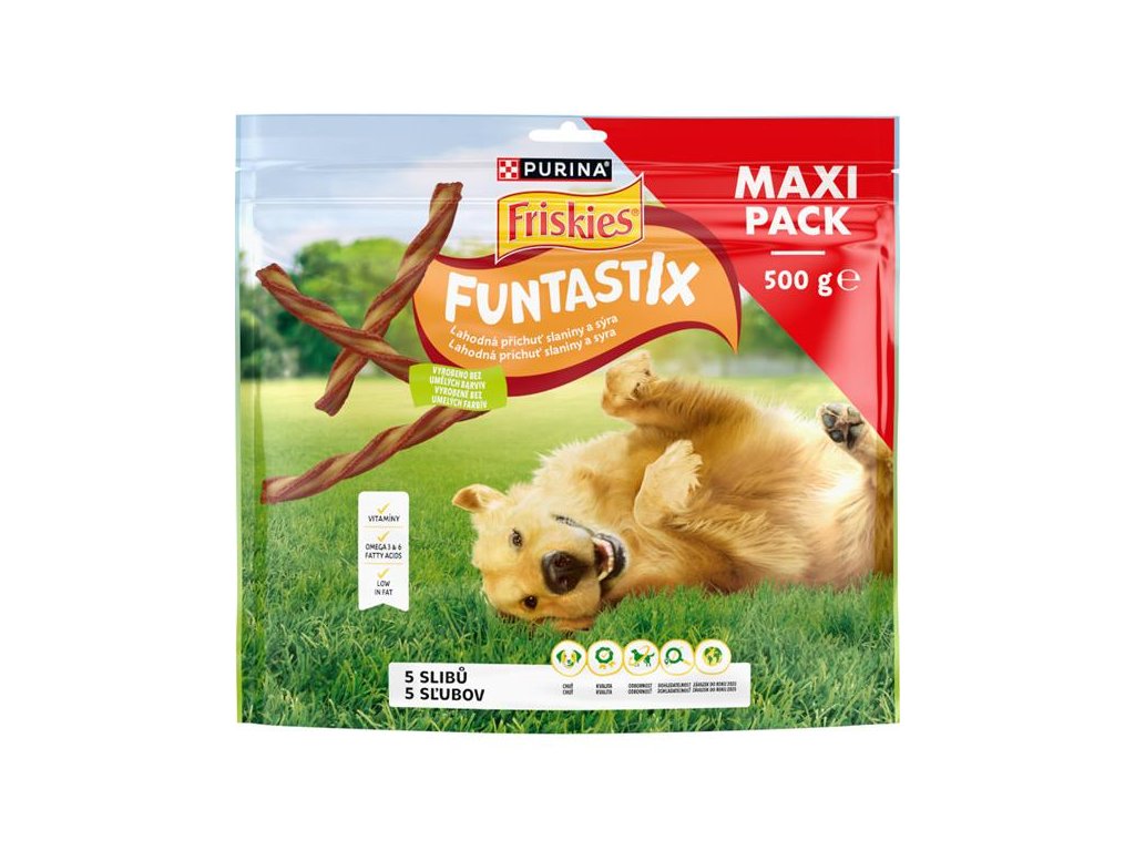 Lahodná kroucená pochoutka s příchutí slaniny a sýra je vyrobená z kvalitních ingrediencí bez přidaných umělých barviv. Tyčinky Friskies Funtastix mohou být podávány kdykoliv jako pochoutka nebo odměna, a to buď vcelku, nebo nalámané na kousky.