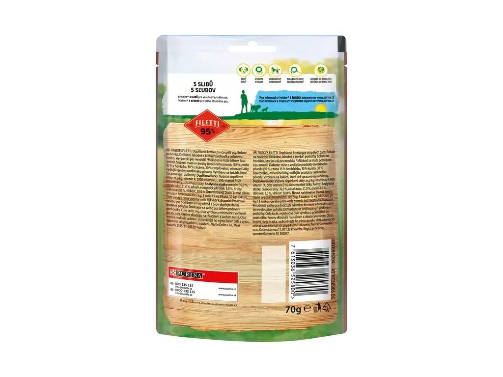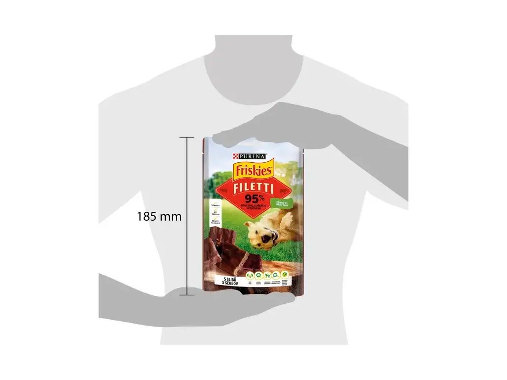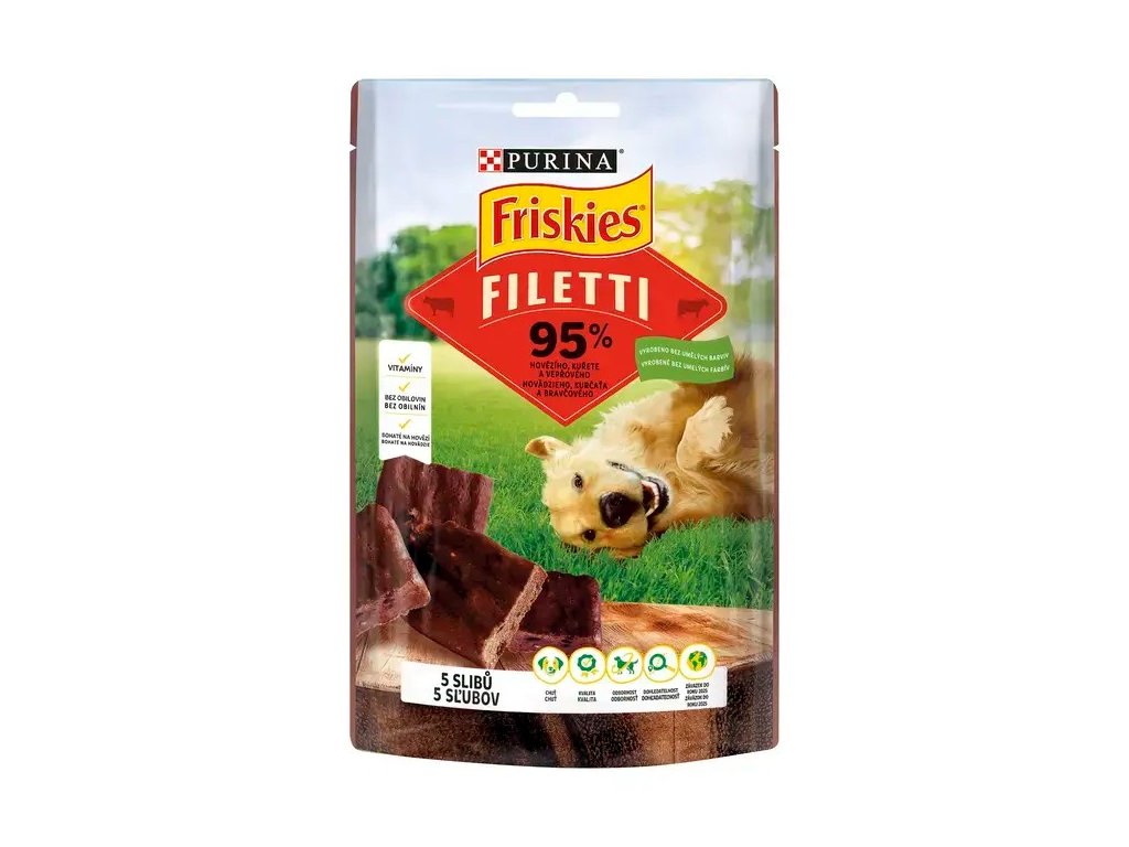 Delikátní a lahodné pochoutky Friskies Filetti bohaté na hovězí, kterým váš pes neodolá! Chutné a jemné pochoutky, vyrobené bez přidaných umělých barviv a konzervantů, které jsou vhodné pro všechny druhy psů a každou denní dobu.