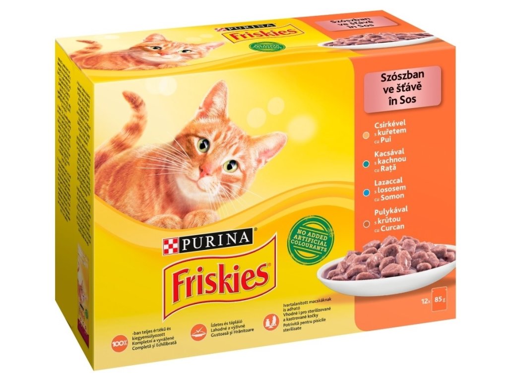 Friskies Cat multipack kuře, losos, kachna, krůta ve šťávě je kompletní krmivo ve formě multipacku pro dospělé kočky, vhodné i pro sterilizované a kastrované kočky.