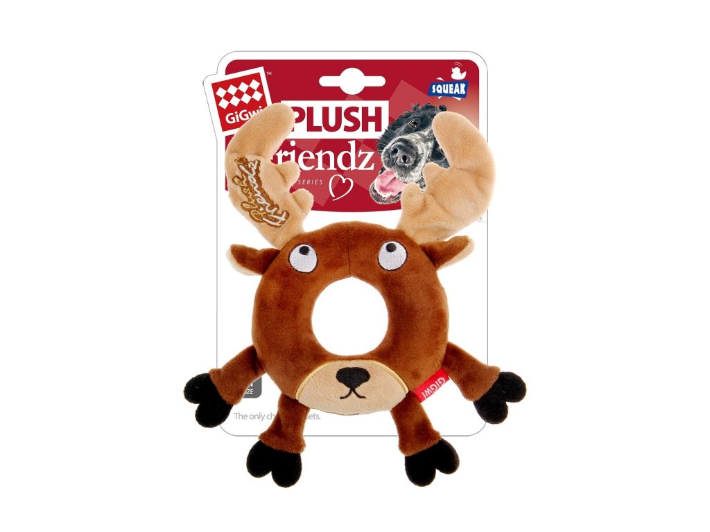 GiGwi Plush Friendz sob je atraktivní hračka, která kombinuje měkký plyš s pevným gumovým kroužkem. Tato interaktivní hračka je ideální pro kousací a přetahovací hry, zatímco pískací prvky umístěné v parozích podporují hravost a pozornost vašeho psa.