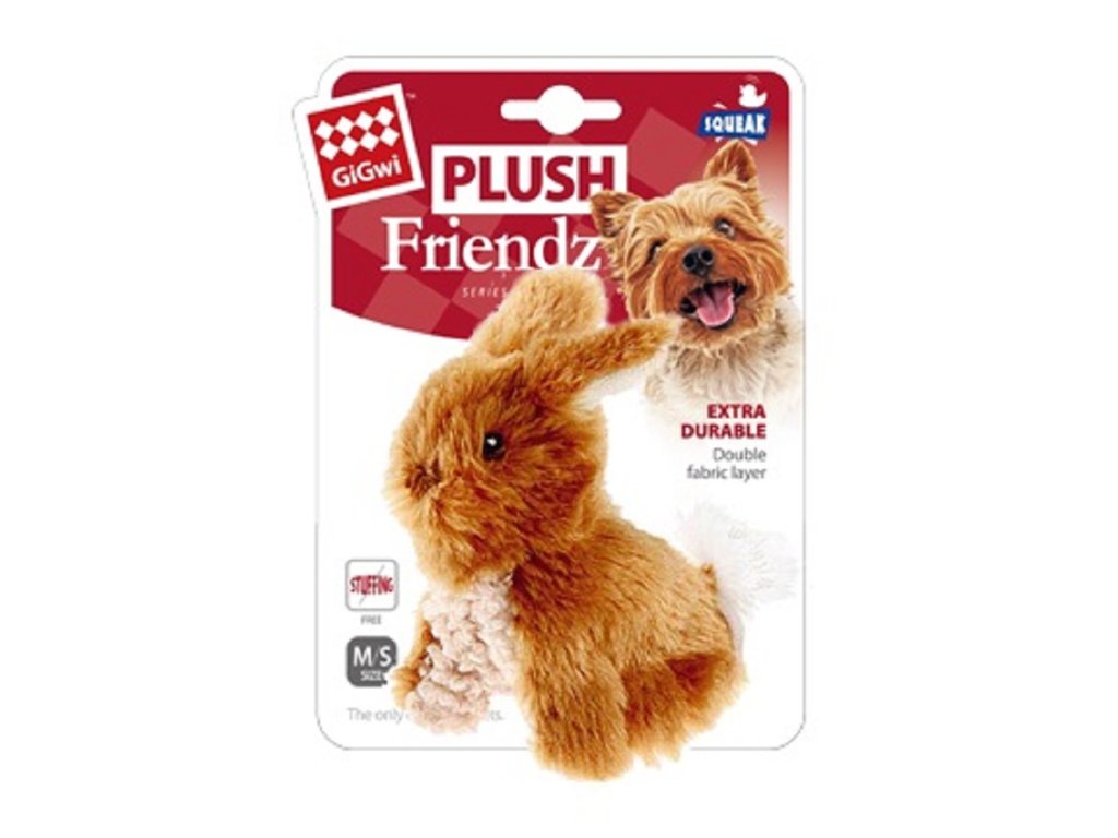 GiGwi Plush Friendz plyšový králíček hnědý je mini hračka navržená pro malé psy, kteří si užívají měkké a přitom pevné hračky. Vyrobena z příjemného materiálu na dotek, doplněna dvojitou podšívkou pro větší odolnost. Při stisku píská, což zajišťuje interaktivní zábavu.