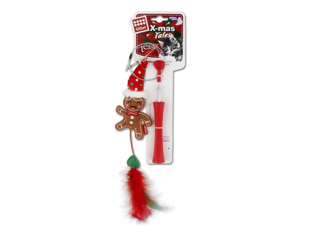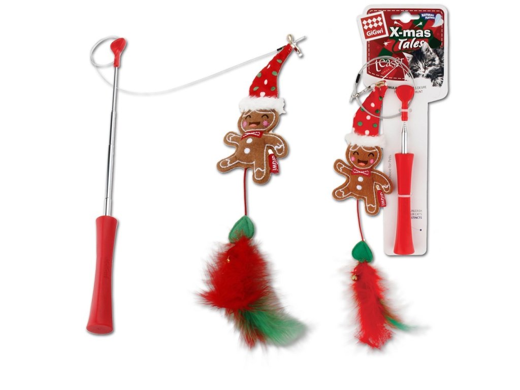 Teleskopická, nerezová udice s textilní hračkou - vánočním perníčkem, ozdobeným peřím a kovovou rolničkou. Ideální hračka k vánočnímu stromečku.