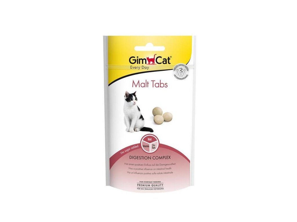 Tablety ve formě pamlsků na podporu trávení pro kočky. Tablety obsahují přírodní aromatický slad a vysoký podíl vlákniny, které podporují trávení a pomáhají posunu chlupových smotků, které se kočkám tvoří v trávicím traktu. Gimcat Malt Tab jsou obohaceny o TGOS (Trans-Galaktooligosacharid), rozpustnou vlákninu získanou z mléka. Ve střevech slouží TGOS jako zdroj potravy pro zdraví prospěšné bakterie, které pomáhají trávit potravu a potlačovat výskyt choroboplodných bakterií. Pamlsky jsou vhodné ke každodennímu podávání a většina koček si je naprosto zamiluje tak, že si jejich pravidelné podání bude vyžadovat. Tablety jsou jednoduchý a chutný způsob, jak zajistit vašemu mazlíčkovi zdravé trávení.