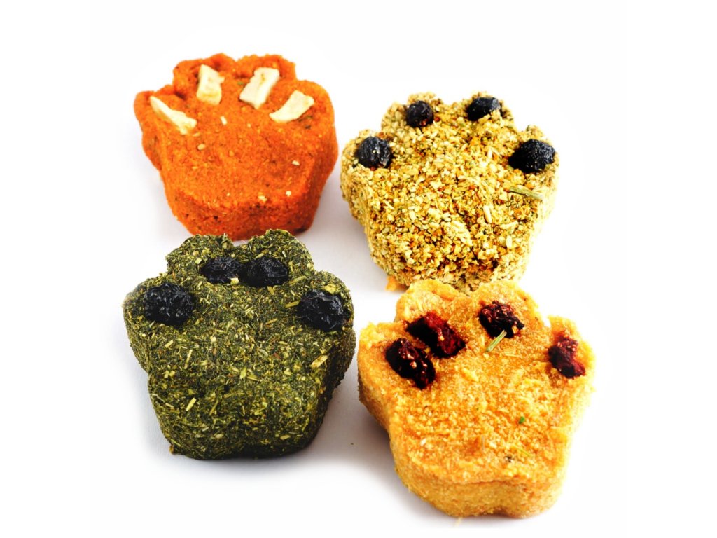 Každý jiný, každý lahodný! Těmto lahůdkám neodolá žádné zvíře. Brokolice, vojtěška, mrkev, špetka červené řepy a pastináku plus trocha černého rybízu a aronie. A po hostině navrch rozemletá bříza k mlsání.