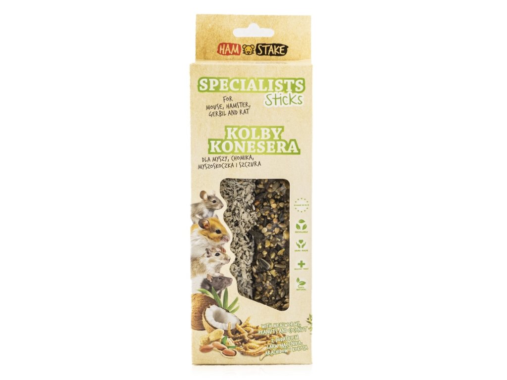 Larvy moučných červů, bohaté na živočišné bílkoviny, jsou výborným doplňkem stravy malých hlodavců. Arašídy poskytují vitamín B3, hořčík a zinek a kokos díky svým antibakteriálním a antivirovým vlastnostem podporuje zdraví zvířat.