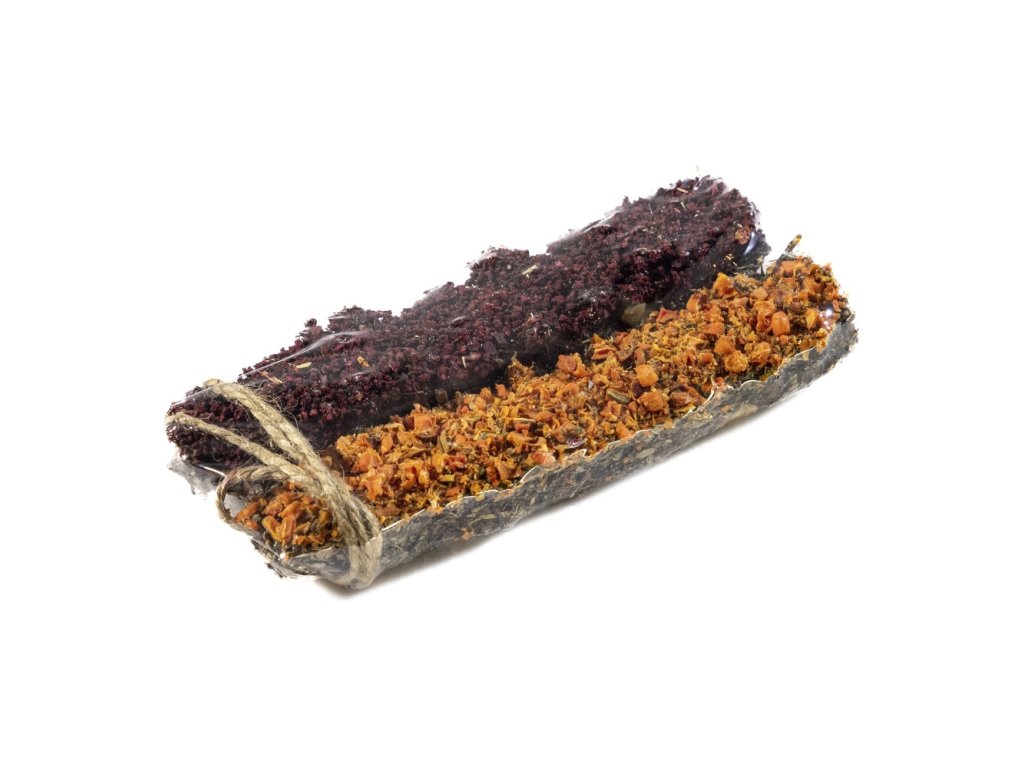 Složení: mrkev, červená řepa, rajče, banán, jablko, pastinák, pampeliška, jitrocel, kopřiva, petržel, echinacea, jetel, vojtěška, máta, list břízy, meduňka, lipový list, měsíček, konopná vláknina, bramborový škrob.