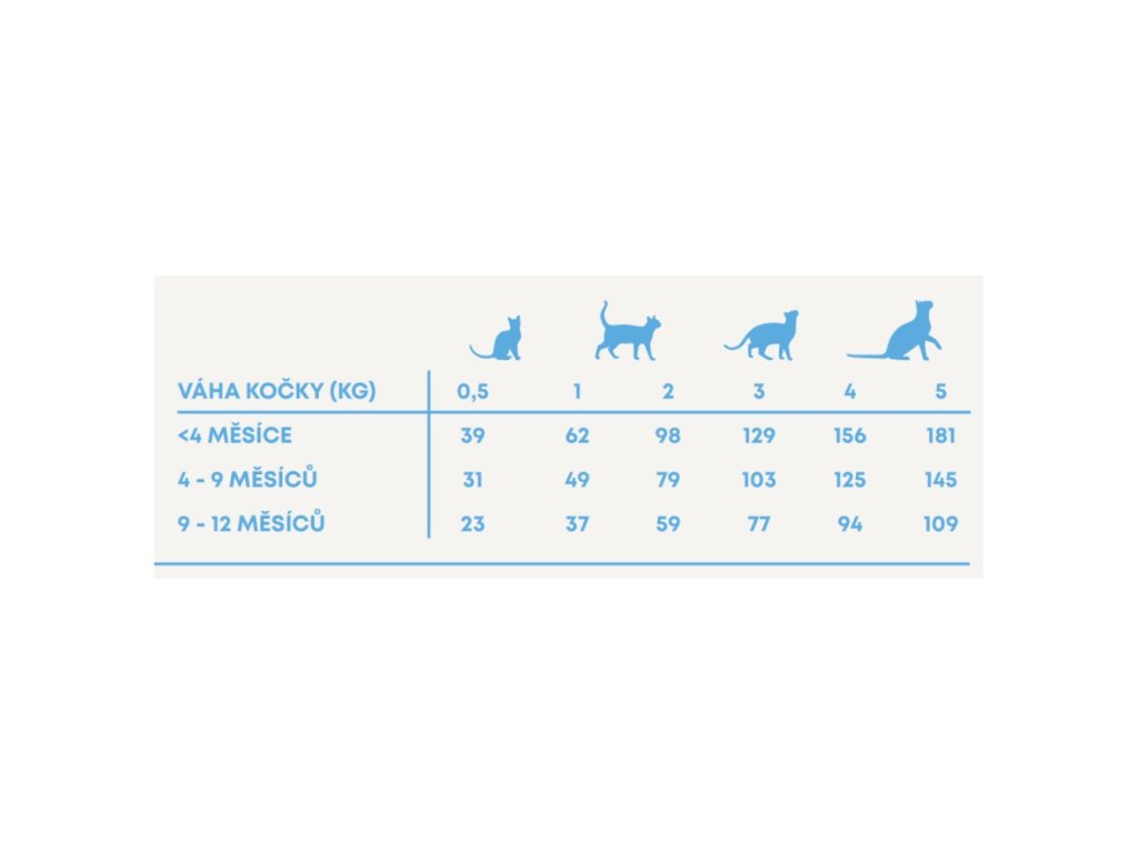 Krmný návod: Změnu krmiva je třeba provádět postupně po dobu 7 dní. Po odstavení krmte 4 x až 5 x za den. Do 4 měsíců věku smícháním s teplou vodou v poměru 1 díl vody a 3 díly krmiva. Odstraňte zbytky krmiva. Kotěti okolo 1 roku postupně snižujte počet krmných dávek až na 2 za den. Kočka musí mít vždy přístup k čisté, čerstvé vodě. Skladování: skladujte na chladném a suchém místě. Obal by měl být po použití vždy bezpečně uzavřen.