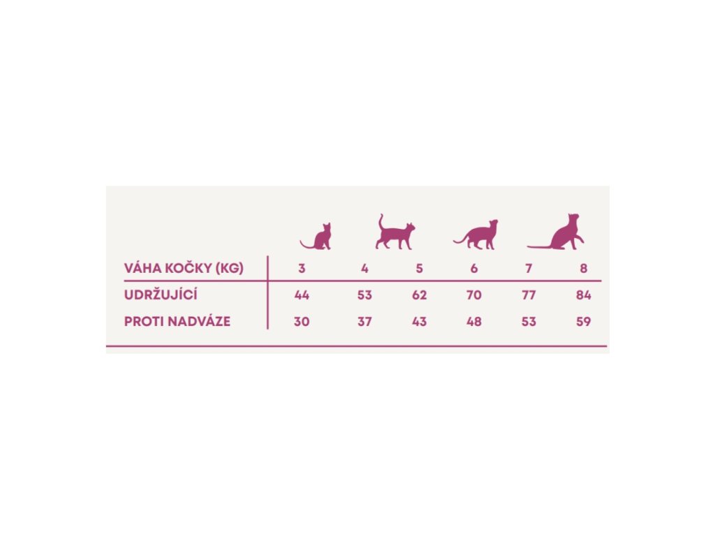 Krmný návod: změnu krmiva je třeba provádět postupně po dobu 7 dní. Jako návod použijte tabulku s dávkováním. Denní množství potravy se může pro každou kočku lišit, záleží na úrovni její aktivity, plemeni a podmínkách prostředí. Denní krmnou dávku podávejte rozdělenou na 2 porce denně, nepoužívejte zbytky krmiva z předchozího dne. Kočka musí mít vždy přístup k čisté, čerstvé vodě. Skladování: skladujte na chladném a suchém místě. Obal by měl být po použití vždy bezpečně uzavřen.