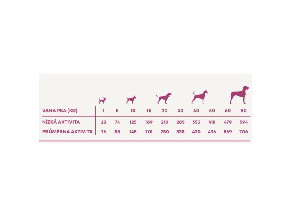 Krmný návod: změnu krmiva je třeba provádět postupně po dobu 7 dní. Jako návod použijte tabulku s dávkováním. Denní množství potravy se může pro každého psa lišit, záleží na úrovni jeho aktivity, plemeni a podmínkách prostředí. Denní krmnou dávku podávejte přednostně rozdělenou na 2 až 3 porce denně, a to vždy ve stejnou dobu. Pes musí mít vždy přístup k čisté, čerstvé vodě. Skladování: skladujte na chladném a suchém místě. Obal by měl být po použití vždy bezpečně uzavřen.