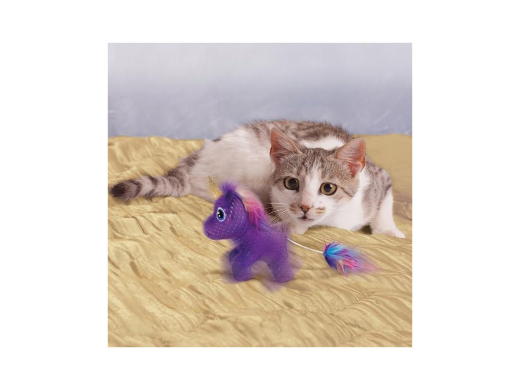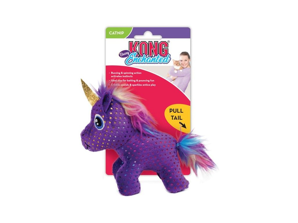 Stačí zatáhnout za ocásek a plyšový jednorožec KONG Enchanted Buzzy Unicorn začne vibrovat, vrnět a točit se na místě. Přičtěte k tomu třpytivé puntíky, šustící hlavu, chlupatou hřívu a ocas a náplň z vysoce kvalitní šanty kočičí a máte hračku, které žádnou kočku nenechá chladnou.