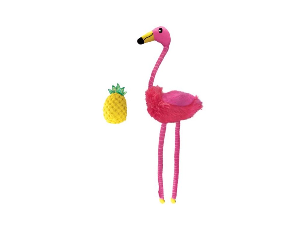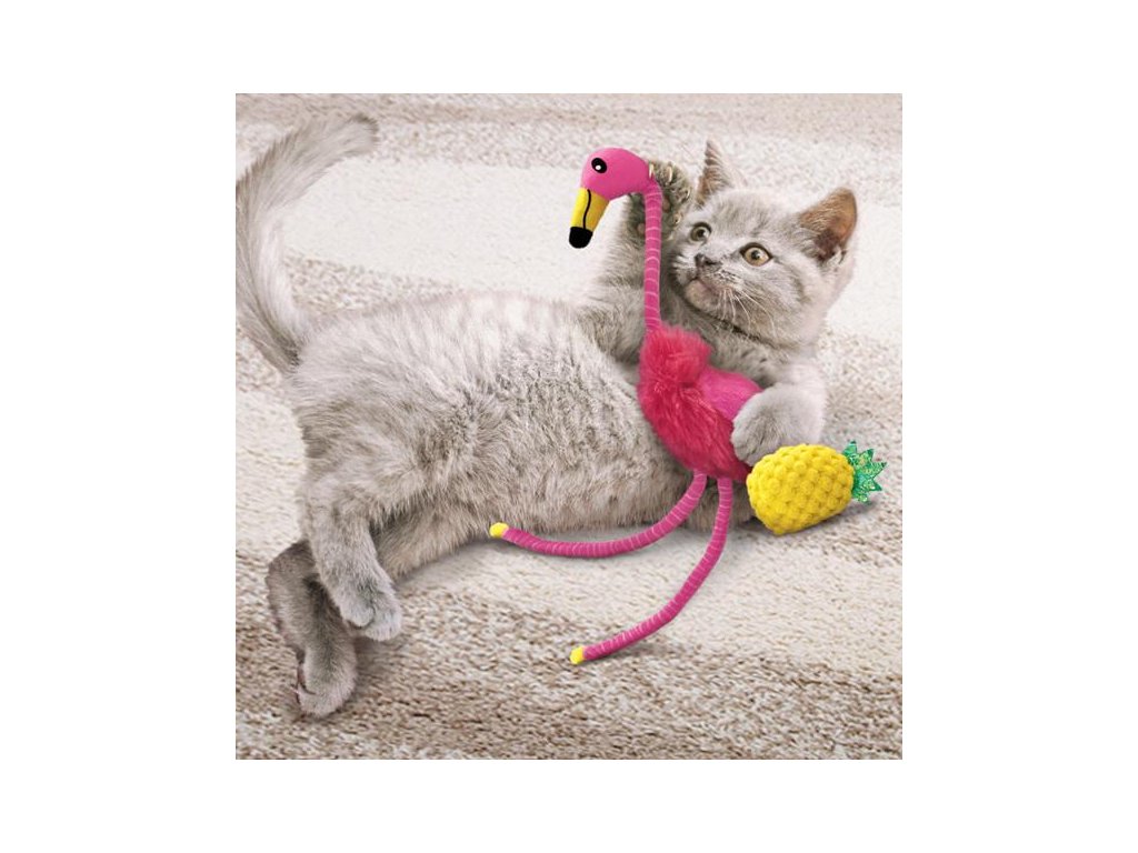 Roztomilý šustivý růžový plameňák s extrémně dlouhýma a pohyblivýma nohama a krkem i výrazně žlutý, měkký a lehký ananas, to všechno je hračka KONG Cat Tropics 2 v 1 pro kočky. Poskytuje jim dvojnásobné potěšení ze hry s možností libovolně obměňovat lovecké manévry a zabaví je na celé hodiny.