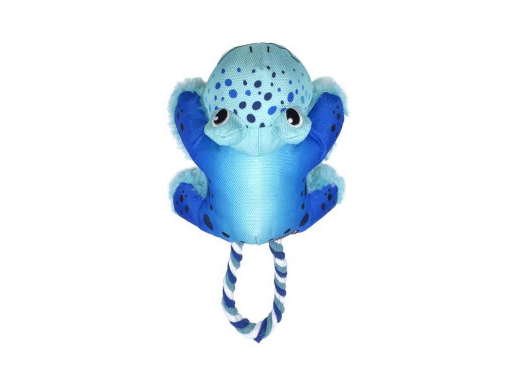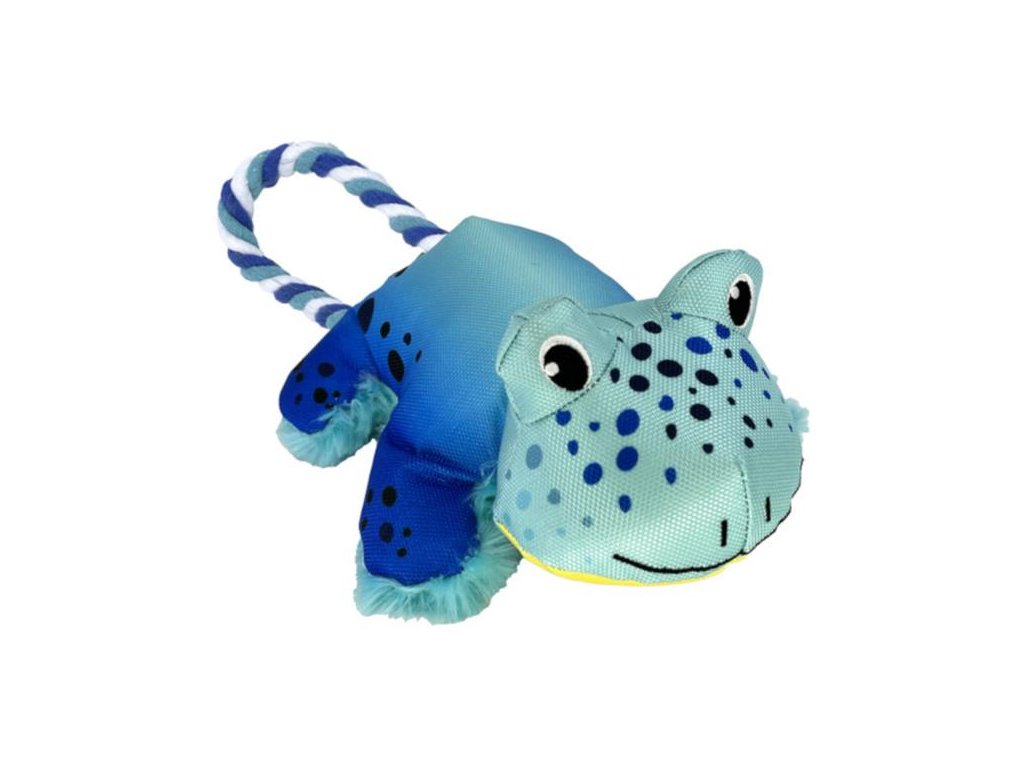 Hračka pro psy KONG Cozie Tuggz Frog je roztomilá barevná žába s provazovou rukojetí – smyčkou ze silného bavlněného lana, jehož konce vytvářejí uzel vnořený do žabího těla. Po skousnutí vydává hračka pískavé zvuky. Břicho a vnitřní stranu končetin pokrývá hebký a měkký plyš, zatímco ostatní části jsou vyrobeny z látky. Hračka dokonale uspokojují přirozené psí instinkty a zabaví na dlouhé hodiny.