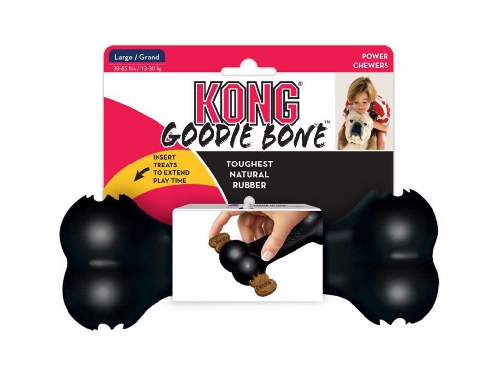 Hračka guma Kost KONG je plnitelná hračka pro psy ze speciální odolné gumy. Je vyrobena z ultra elastického čistě přírodního kaučuku, pomáhá čistit chrup a masíruje dásně. Speciální tvar zajišťuje při dopadu nepravidelný odraz. Hračku lze naplnit pamlsky nebo pastou a zvýšit tak zájem psa o hračku.
