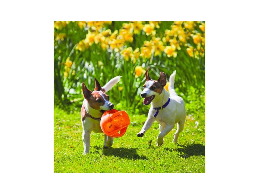 KONG Jumbler je skvělou interaktivní hračkou na házení, aportování a tahání se psem. Hračka má vestavěné pískátko, je nejen zábavná, ale i bezpečná. Obsahuje uvnitř tenisový míček, který podporuje hru psa pohybem uvnitř.