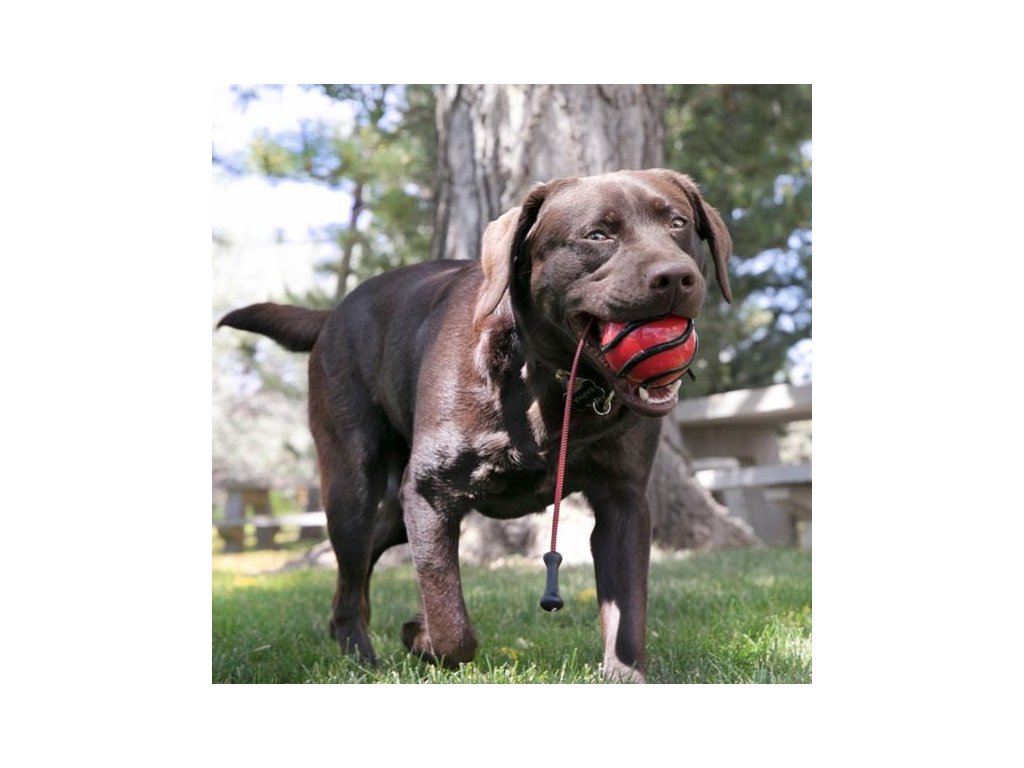 KONG Wavz Bunjiball je odolný gumový míček, k němuž je připevněno elastické lano s ergonomickým držadlem. Díky tomu jím snadno dohodíte na velkou vzdálenost, aniž byste si museli namáhat rameno. Míč stačí jen roztočit vedle těla a pustit.