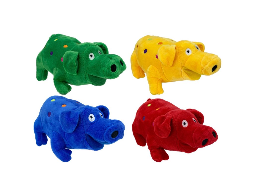 Plyšové plně vycpané prasátko o velikost 23x11cm. V těle má 1x pískátko.