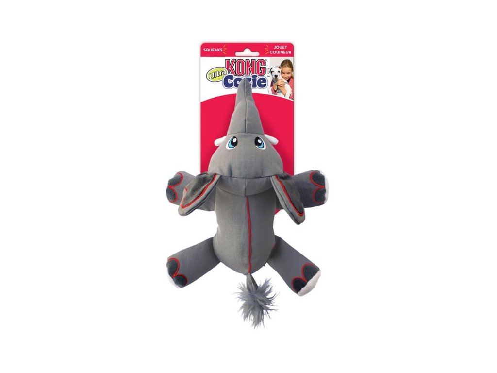 Slonice Ella z řady KONG Cozie Ultra je vyrobena technologií Ultra-Tex, která výrazně prodlužuje životnost hračky kombinací mimořádně pevné tkaniny (s tzv. ripstop úpravou zvyšující odolnost proti prodření nebo protržení), robustní vnitřní podšívky a zesílených švů.