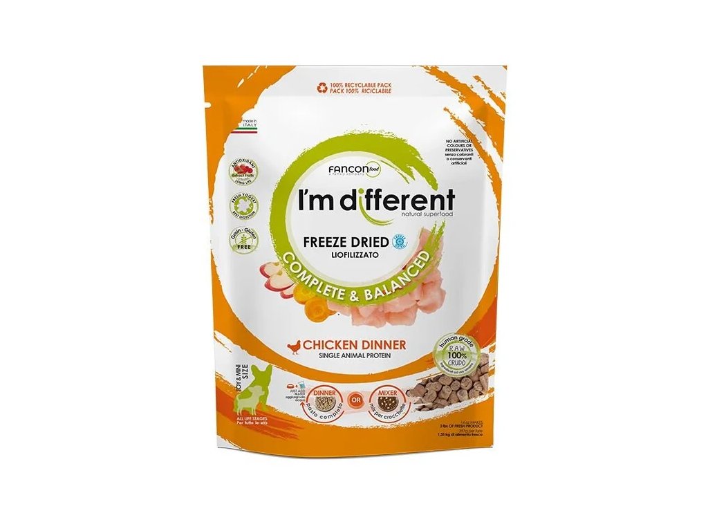I´M DIFFERENT Chicken DINNERMrazem sušená receptura byla navíc obohacena o speciální a přírodní směs extraktu z červeného ovoce jako látky proti stárnutí a o čerstvý jogurt, který pomáhá podporovat lepší trávení. Pokud uvažujete o přechodu svého psa na raw, je toto exkluzivní krmivo z lyofilizovaného kuřecího masa tou nejlepší alternativou pro začátek. Opravdové potěšení. Váš pes si ji zamiluje a bude misku vylizovat do čista.