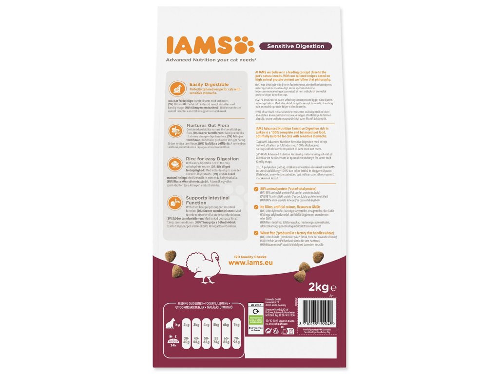Krmivo IAMS for Vitality Sensitive Digestion pro dospělé a starší kočky s vysokým obsahem krůtího masa je 100% kompletní a vyvážené, odborníky sestavené krmivo, které podporuje sedm znaků zdraví a vitality kočky a pomáhá s citlivým trávením. Veškeré živiny jsou obsažené v lahodné receptuře s 88% obsahem živočišných bílkovin, na které si vaše kočky pochutnají každý den.